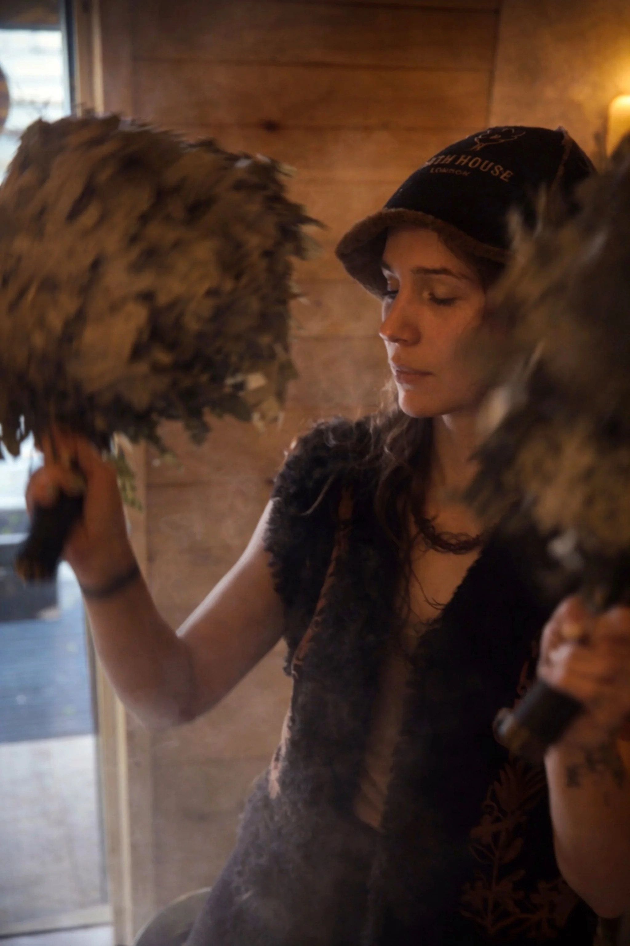 Steam is guided through the space, plants are introduced through scent and touch, and the body is worked with through heat and whisking.